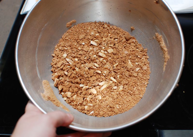 Combine everything in a stand mixer. Mix over low speed with the paddle attachment for about a minute, until it comes together as a nice sandy crunch.