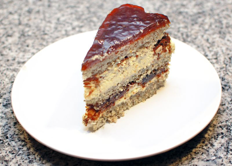 Use the back of a spoon to spread half of the lemon mascarpone in an even layer over the base of the cake. Sprinkle half of the almond-tea-crunch evenly across the top of the lemon mascarpone. Finally, use the back of a spoon to spread one-third of the tea jelly as evenly as possible over the crunch. (This step wasn’t easy, so I just did little dollops of jelly, and you could still taste it in the finished cake.)