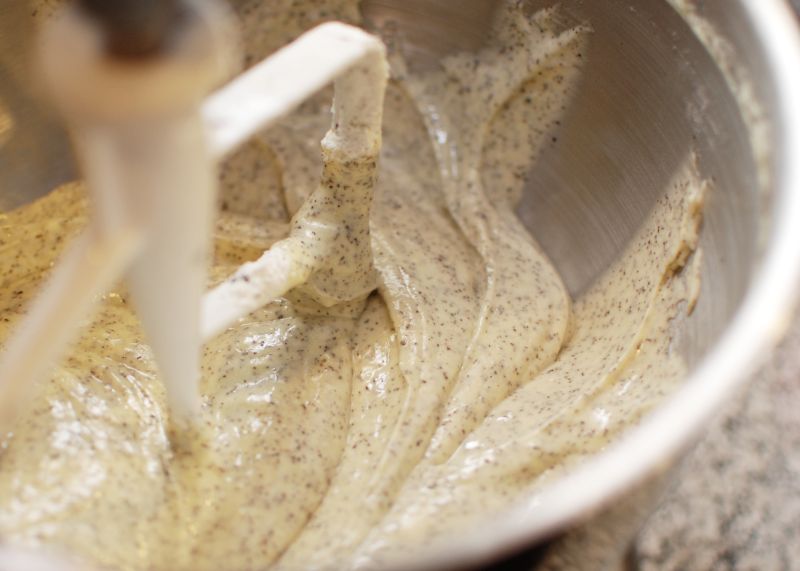 Combine the flour, tea leaves, baking powder, and salt in a separate mixing bowl. With the mixer running on low, incorporate the dry ingredients into your main bowl. You don’t want to overmix the cake; just mix until the dry ingredients disappear (45 seconds or so).