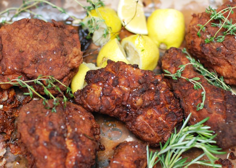 Once the oil has reached 350 to 365 degrees F, working in batches, carefully add the chicken pieces 3 or 4 at a time. Fry, turning the pieces once, until golden brown and cooked through, about 12 minutes. Total cooking time should be about 30 minutes. When the chicken is done, take a big skimmer and remove the chicken pieces and herbs from the pot, shaking off as much oil as you can, and lay it on a tea towel or brown paper bag to soak up the oil. Sprinkle all over with more salt and a dusting of cracked black pepper. Repeat with the remaining chicken pieces. Once all the chicken is fried, scatter the fried herbs and garlic over the top. Serve hot, with big lemon wedges.