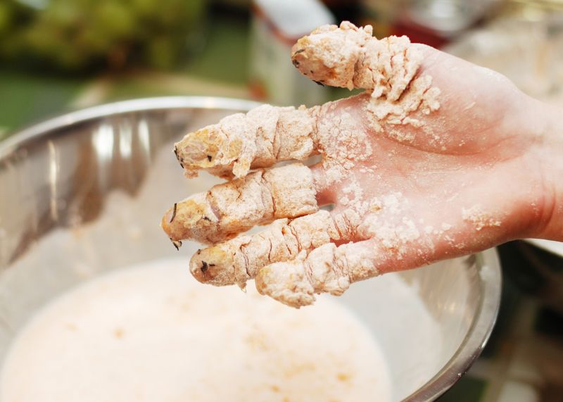 - Once you’ve battered the pieces, be sure and let them rest for 5 to 10 minutes. This lets the coating really set so it won’t fall off during frying.