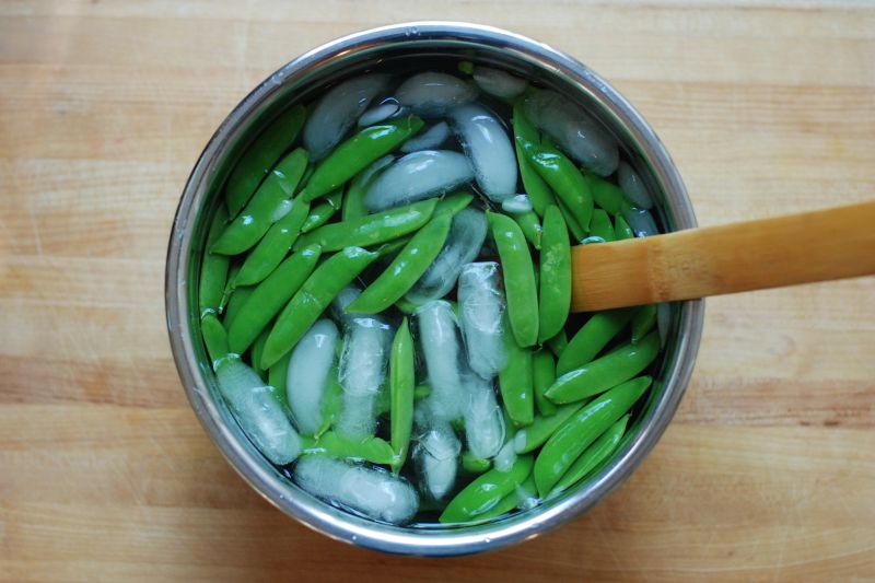 Blanch the peas in a large pot of boiling water for about 30-60 seconds. Immediately transfer to an ice bath, which will not only cool them off but also stop the cooking process and make them into the desired cartoon green color. Give the peas a rough chop and set aside.